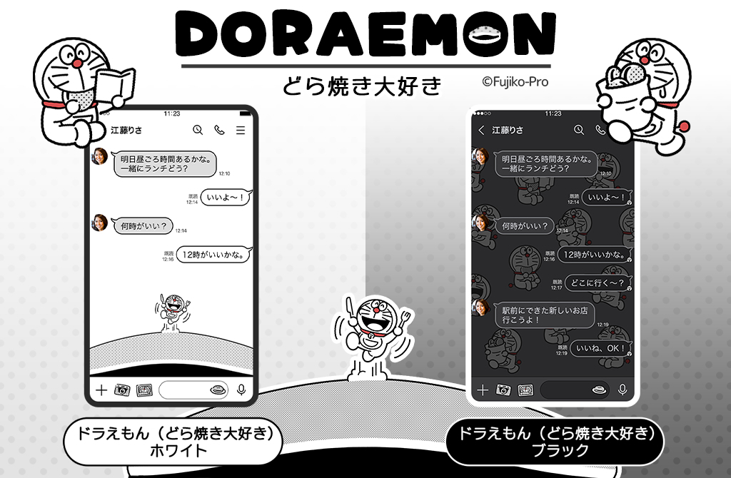 新作LINE着せかえ「ドラえもん(どら焼き大好き)ホワイト&ブラック」をダブル配信!