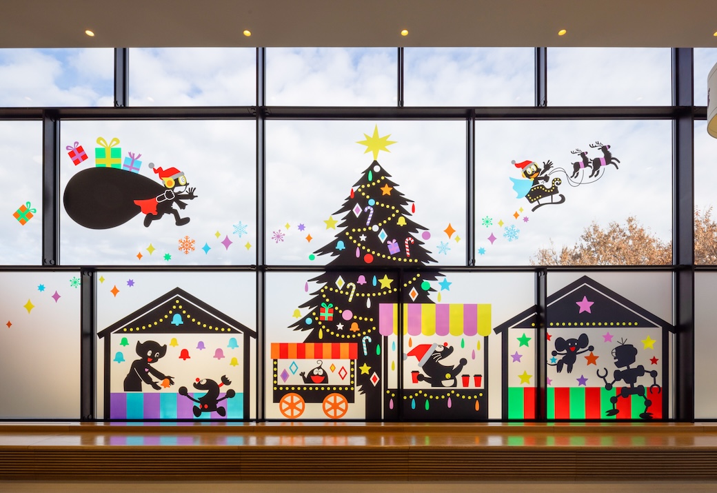 2F「みんなのひろば」の大窓に、クリスマスを楽しむFキャラクターたちのシルエットが出現!