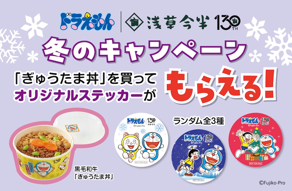 浅草今半弁当売場各店では、浅草今半創業130周年記念「冬のキャンペーン」を実施中!12月1日(月)~1月18日(日)の期間中、ドラえもんデザインのお弁当「ぎゅうたま丼」のご購入で、ドラえもんのオリジナルステッカー(冬バージョン 全3種)がご購入1個につきランダムで1枚もらえます。今年の年末年始は、ドラえもんデザインの「ぎゅうたま丼」と一緒に楽しくて美味しい時間を過ごしましょう♪