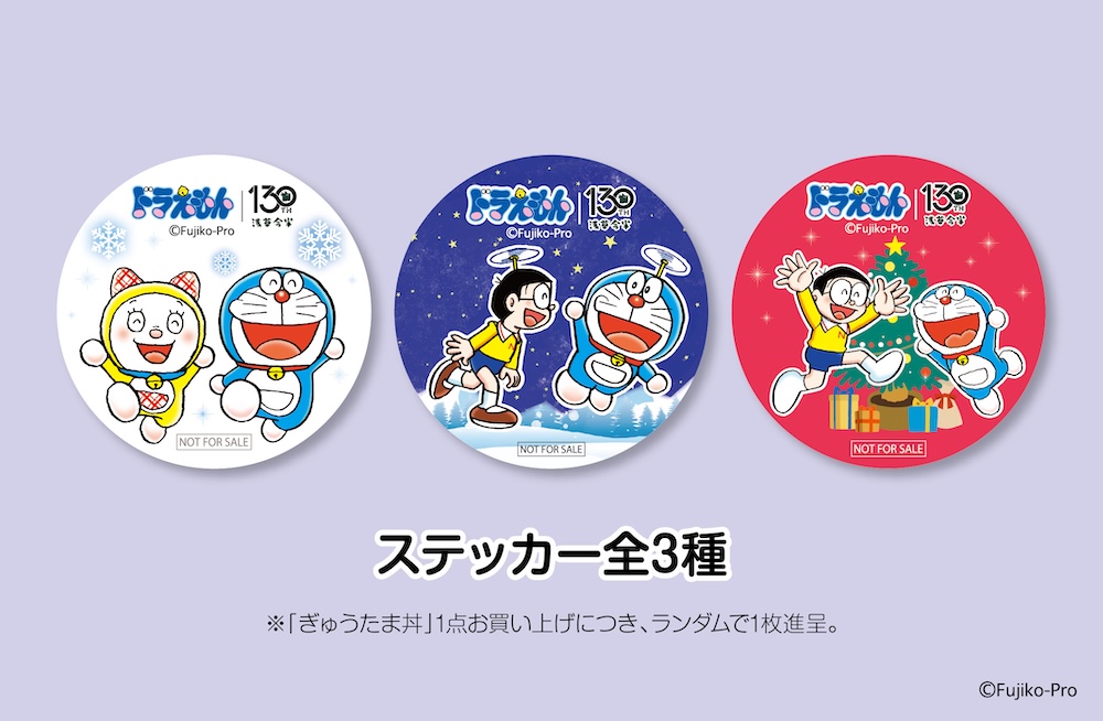 〇内容:「ぎゅうたま丼」のお買い上げ1点につきオリジナルドラえもんデザインステッカー(冬バージョン 全3種)をランダムで1枚プレゼント。