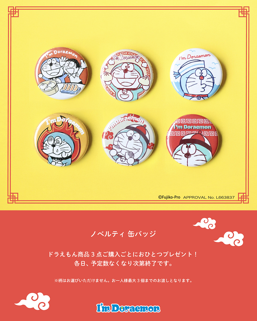 ドラえもんアイテム3点ご購入ごとにおひとつプレゼント!ちょこんとサイズの32mm径なのでワンポイントにぴったり♪