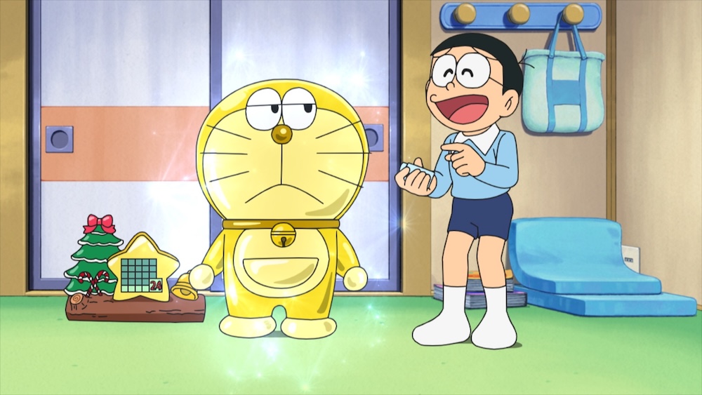 そんな中、未来のアドベントカレンダーに興味(きょうみ)を示(しめ)すのび太。毎日一つずつ、おかしではなく、ひみつ道具が出てくるのだという。のび太がカレンダーの日付部分にさわると、引き出しが開き、中から『メッ金粉(きんぷん)』というひみつ道具が飛び出してくる。しかも、のび太がキャップを外してしまったため、ドラえもんは全身金粉だらけに…!