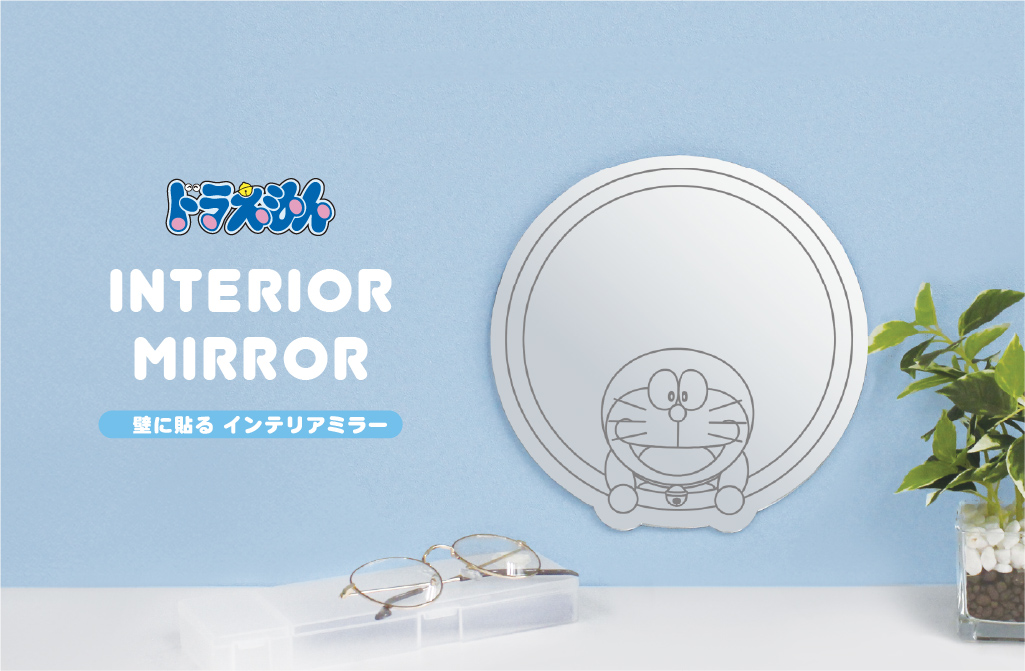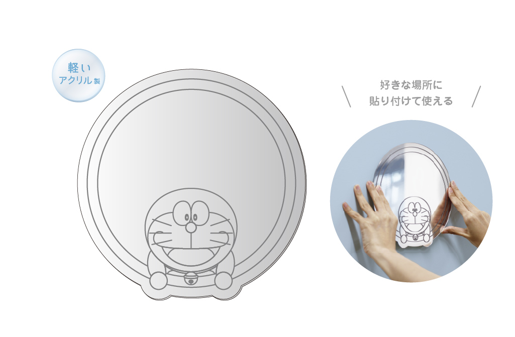 通りぬけフープを使ってドラえもんがやってきたようなインテリアミラーが新発売!軽量なアクリル素材で、壁に貼って使うことができるミラーです。