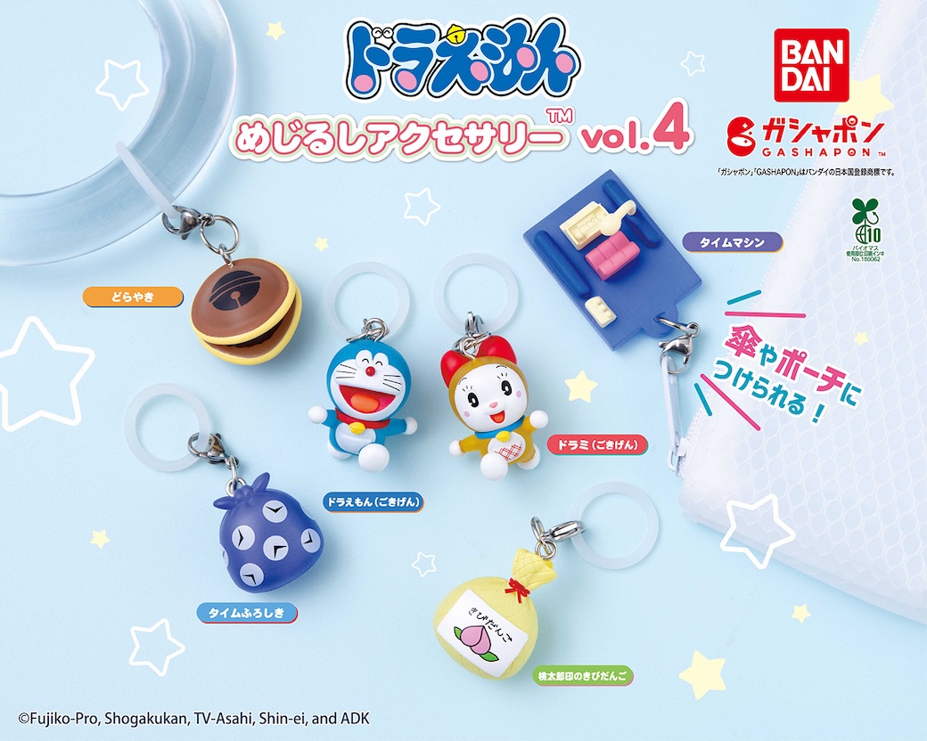 ガシャポンの人気シリーズ「ドラえもん めじるしアクセサリー」に第4弾が登場!ごきげんな表情とポーズがかわいいドラえもん、ドラミちゃんに加え、どらやきや、人気のひみつ道具が全6種ラインナップ!傘やペットボトル、ポーチなどいろんなところにつけて楽しもう♪