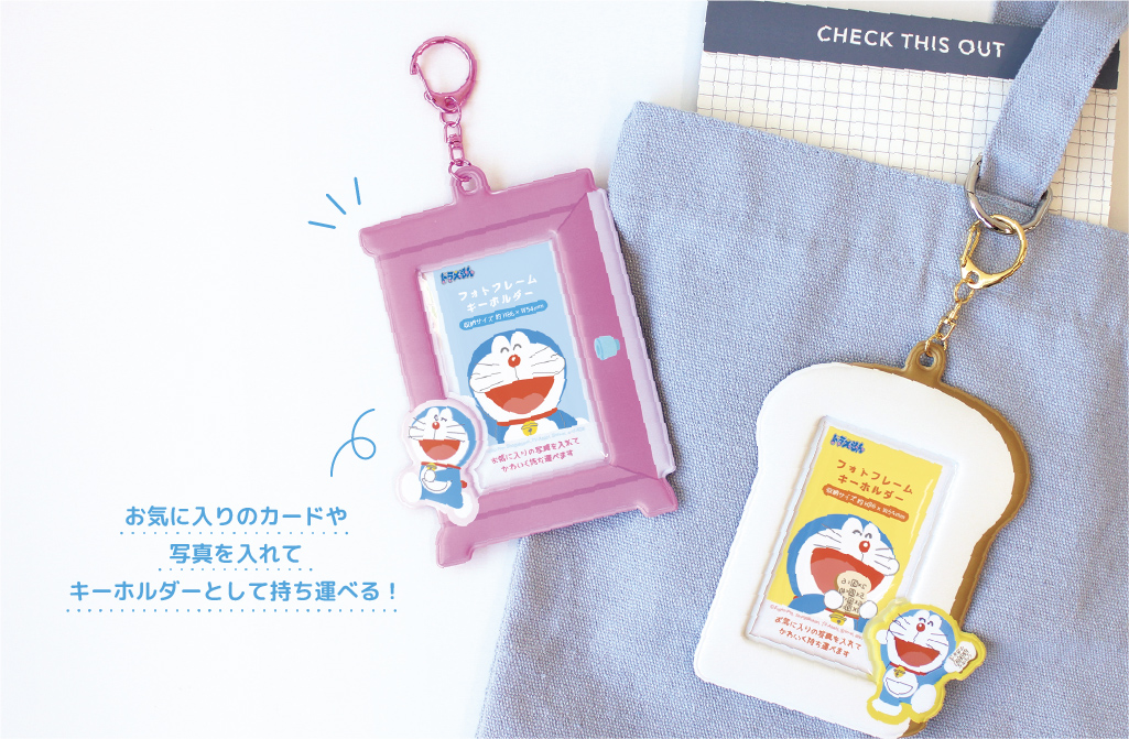 お気に入りのカードや写真を入れてキーホルダーとして持ち運べる「フォトフレームキーホルダー」。約H86×W54mmまでのカードや写真を入れる事が可能です。どこでもドアとアンキパンの2種類♪