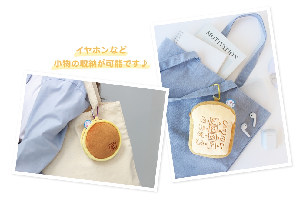 イヤホンや小物を入れて持ち運べる「カラビナ付きぬいぐるみファスナーマスコット」。ドラえもんがぴょこっとのぞくポーチは、バッグにつければインパクト抜群のサイズ感!どら焼きとアンキパンの2種類♪