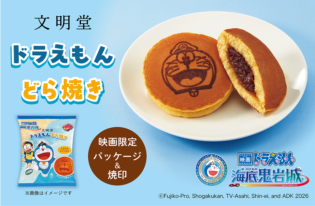『映画ドラえもん 新・のび太の海底鬼岩城』2026年2月27日(金)公開を記念して、文明堂から「映画ドラえもん どら焼き」が期間限定で登場!パッケージは、『映画ドラえもん 新・のび太の海底鬼岩城』限定デザイン。どら焼きにはもちろんドラえもんの焼印が押されています。