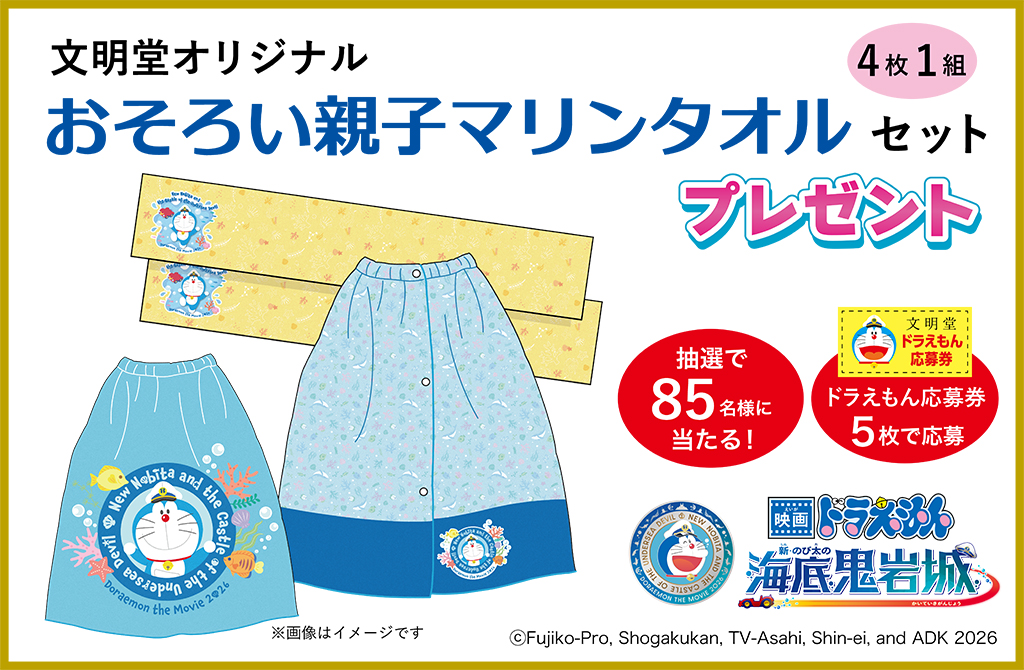 【文明堂オリジナル「映画ドラえもん 新・のび太の海底鬼岩城」おそろい親子マリンタオルセット】が当たります!映画のワクワクをおやつでも♪ドラえもんの大好物の「どら焼き」を食べてさらに楽しもう!
