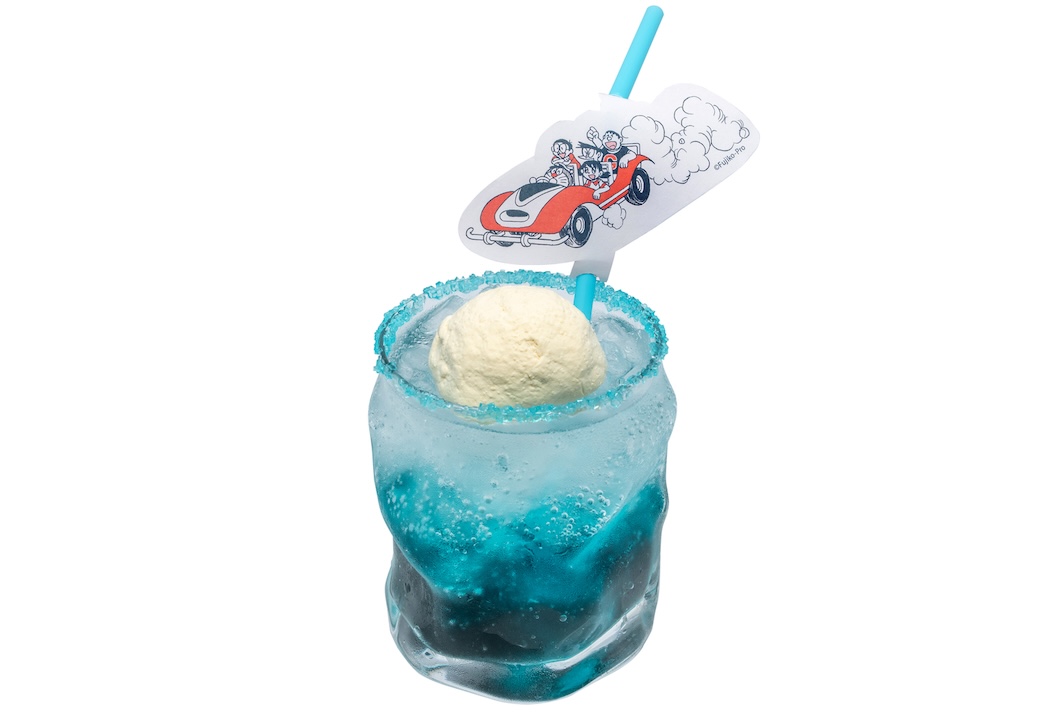深さによって青の濃さが変わる海の色を、サイダー、青いゼリー、黒いゼリーの3層で表現。青いゼリーはパイナップル味、黒いゼリーはレモン味です。グラスのふちの青いザラメは、水面の輝きを表現しています。