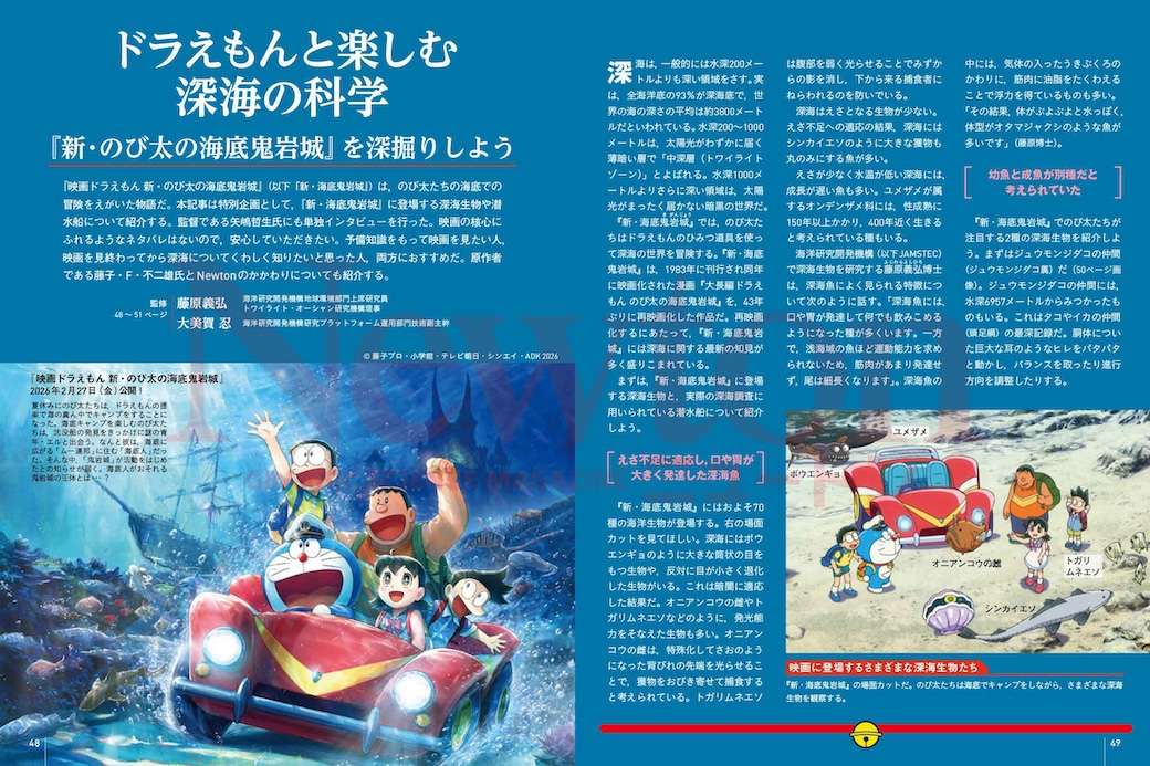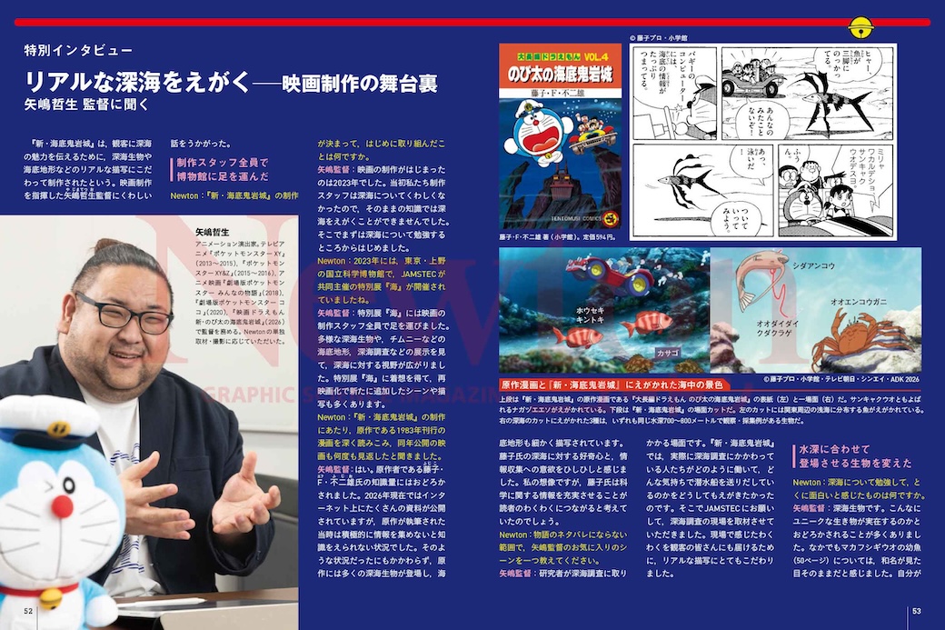 2026年2月26日発売の『Newton』4月号では、『映画ドラえもん 新・のび太の海底鬼岩城』に登場する深海生物や潜水船について海洋研究開発機構(JAMSTEC)の専門家が解説。さらに映画の矢嶋哲生監督に単独インタビューを行い、リアルな深海描写へのこだわりや制作の舞台裏についてお聞きしました。
