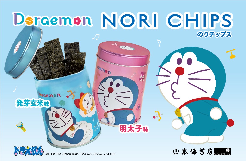 メタリックの缶に、ドラえもん&ドラミとひみつ道具をあしらったオリジナルデザインののりチップスが新発売!