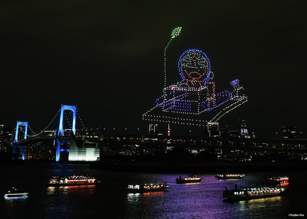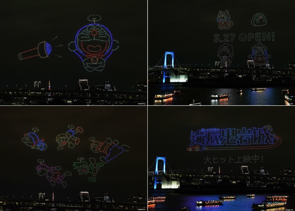 ▼① ドローンショーにてアニメに先駆け「日本会場オリジナルドラえもん」が夜空へ!