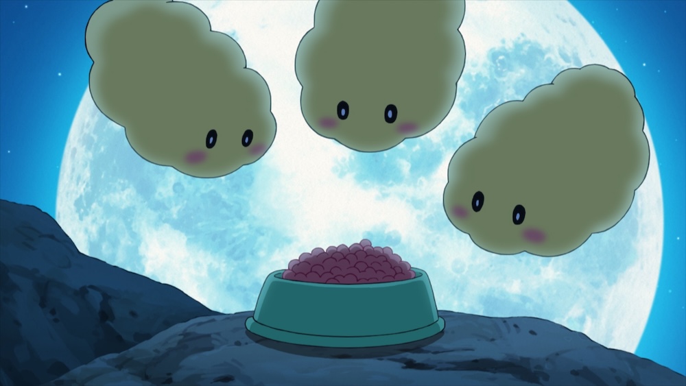 しばらくすると、子どもらしきキント雲が5ひきほどきんとフードによって来る。どうにかその中の1ひきをつかまえることに成功したのび太は、大よろこび!