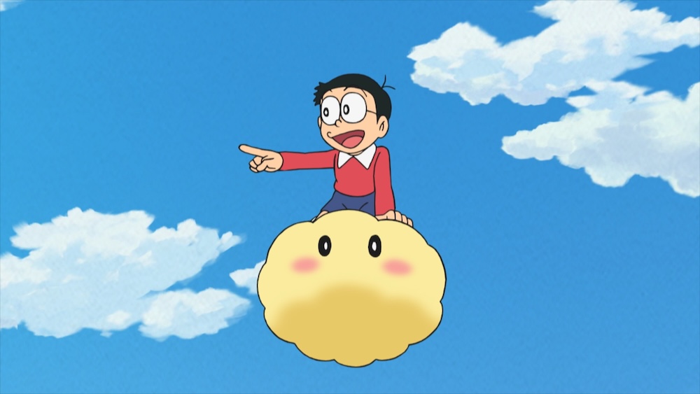 次の日の朝、またしてもねぼうしたのび太は、「まずは、乗りこなす練習をしないと」とドラえもんが止めるのも聞かず、キント雲に飛び乗り、学校を目指すことに。しかし、キント雲はのび太の言うことをまったく聞かず、日本中を飛び回って、けっきょく学校についたのはお昼すぎだった…。