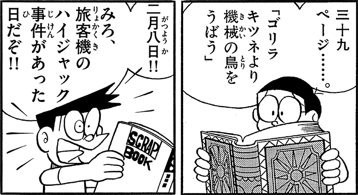 のび太の部屋に突然置かれていた謎の本。「ゴリラキツネより機械の鳥をうばう」という不気味な予言(?)に対応するように、この日旅客機のハイジャック事件が起こっていた! (36巻「大予言・地球の滅びる日」)