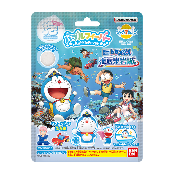 X(Twitter)にシェア Facebookにシェア LINEにシェア 2026.02.16 お風呂で映画の世界観を♪ 『映画ドラえもん 新・のび太の海底鬼岩城』のびっくらたまご バブルフィーバー が登場! 入浴剤を湯舟に入れて、湯面にシャワーを当てると泡風呂が出来上がります!白いもこもこの泡の中から、ドラえもんたちのマスコットが1つ出てきます。 びっくらたまごバブルフィーバー 『映画ドラえもん 新・のび太の海底鬼岩城』 価格:550円(税込) マスコットは全4種類!映画でも活躍するエルや水中バギー等のマスコットを、ぜひ集めてみてね! 詳しくはこちら 発売:株式会社バンダイ 発売時期:2026年2月16日 問い合わせ先:0570-041-101 映画グッズ雑貨ドラえもん映画2026 ドラえもんチャンネル 2026-02-16 09:32:26 ドラえもんチャンネル http://dora-world.com/assets/images/image.png