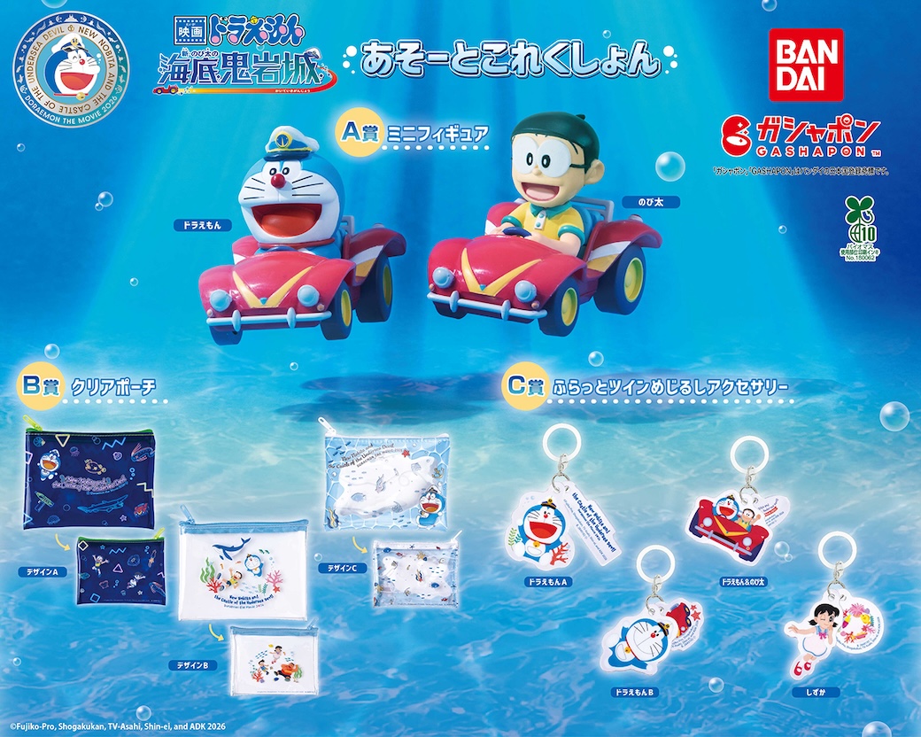 バンダイのガシャポンに、「『映画ドラえもん 新・のび太の海底鬼岩城』あそーとこれくしょん」が登場!どれが出るかお楽しみの「あそーとこれくしょん」のアイテムは、映画で大活躍の「水中バギー」に乗ったドラえもんとのび太のミニフィギュアをはじめ、水中にいるようなデザインのクリアポーチ、2つのパーツがかわいいふらっとめじるしアクセサリー!映画の世界観をたっぷりと味わってくださいね♪