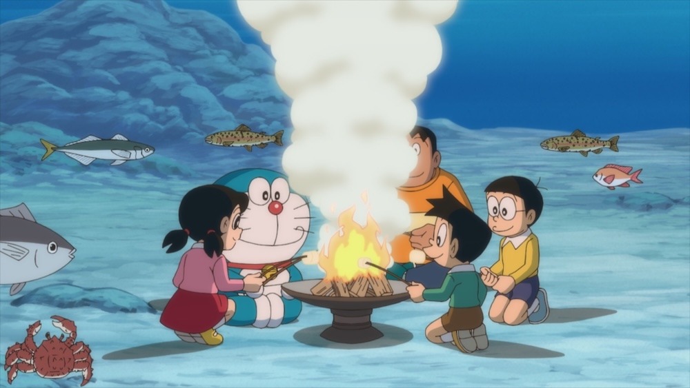 どんな場所でも適応(てきおう)してすごせるようになる『テキオー灯』の光をあび、湖の中に入っていくのび太たち。さっそくドラえもんが取り出した『水中キャンプセット』の、まるでコテージのような『水中テント』にみんな大よろこび。