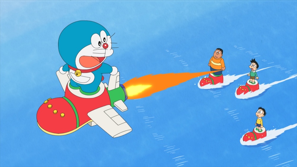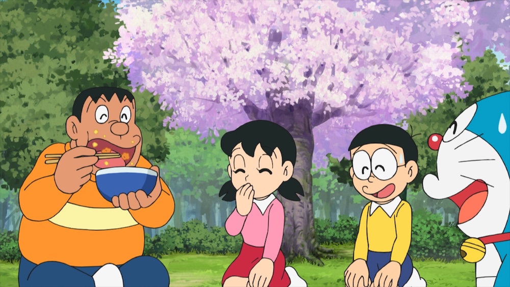 あっという間にボールを集めてジャイアンにわたすと、笑顔で立ち去るのび太。そして、お花見に行ったものの、こんでいてぜんぜん見られなかったと落ちこむしずかのために、乗りものぐつをボートにして、川をたどって桜のさいている場所をさがすことを思いつく。