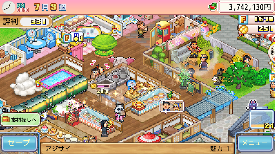 どら焼きをはじめとした美味しそうなお菓子を作りながら、たくさんのキャラクターたちと出会い、お店をドンドン大きくしていくゲームです。