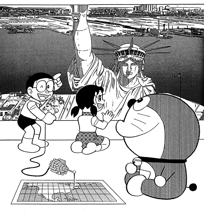 1886年(明治19年)のこの日、アメリカ独立100周年記念を祝うために、ニューヨークのリバティ島で「自由の女神」像の除幕式が行われた。アメリカの独立100周年は1876年だったがそれに間に合わず、10年後のこの日に執り行われた。 「室内世界旅行セット」を使えば、世界のどこでも今の景色をそのまま映すことができる。 (プラス3巻「室内世界旅行セット」)